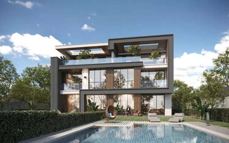 المشروع عبارة عن Boutique Compound مخصص للفيلات فقط، بتصميمات عصرية (Modern) تعتمد على الواجهات المفتوحة والزجاج لضمان الإضاءة الطبيعية.