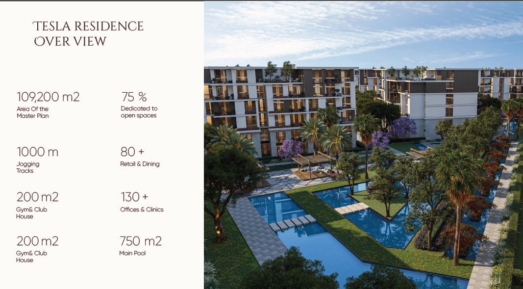 tesla residence هو مشروع سكني استثماري جديد يقدم تجربة متكاملة تمزج بين الراحة والخصوصية والرفاهية والطبيعة الخلابة، فقد قامت الشركة المطورة بتخصيص ما يصل إلى 75% من إجمالى مساحة المشروع للمسطحات الخضراء والبحيرات الصناعية.